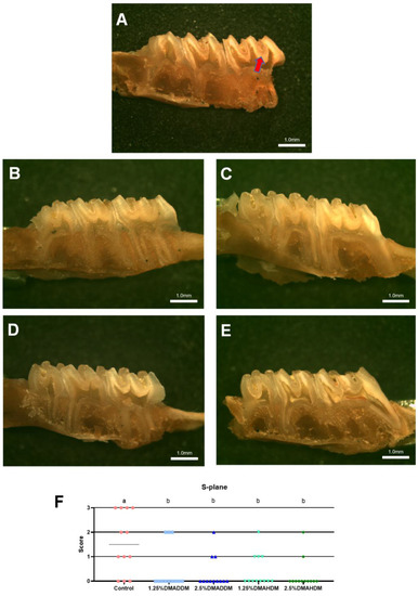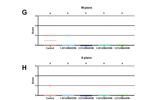 Evaluation of secondary caries by modified Keyes’ scoring. (A–E) Representative images of maxillary specimens: the control (A), 1.25% DMADDM (B), 2.5% DMADDM (C), 1.25% DMAHDM (D) and 2.5% DMAHDM (E). The carious lesions were dyed red (red arrow). Scale bars = 1 mm. (F–H) Modified Keyes’ scoring of the lesions in the S-plane (F), M-plane (G) and X-plane (H). Data are presented as scatter plots; n = 12. In each plot, groups with the same letter indicate no significant difference between them (p > 0.05), while groups with different letters indicate significant difference between them (p < 0.05).
