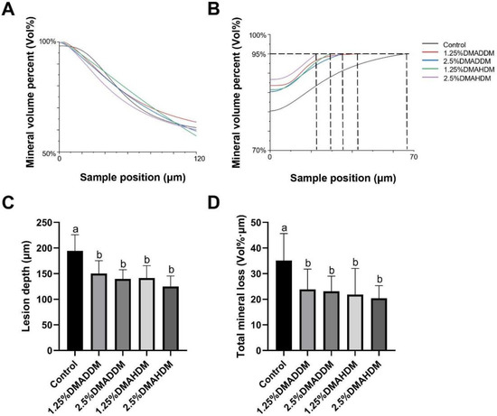 Evaluation of secondary caries by micro-CT. (A,B) Mineral volume curves of enamel (A) and dentin (B). (C) Lesion depth in rat teeth. (D) Total mineral loss in rat teeth. Data are presented as mean ± SD; n = 12. In plot (C,D), bars with the same letter indicate no significant difference between the groups (p > 0.05) while bars with different letters indicate significant difference between the groups (p < 0.05).