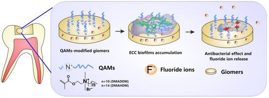 Schematic illustration of the QAMs-modified giomers with non-releasing antibacterial effect and fluoride release property.