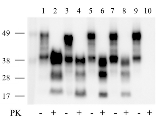 - Brandner, S.; Isenmann, S.; Raeber, A.; Fischer, M.; Sailer, A.; Kobayashi, Y.; Marino, S.; Weissmann, C.; Aguzzi, A. Normal host prion protein necessary for scrapie-induced neurotoxicity. Nature 1996, 379, 339–343. [Google Scholar] [CrossRef] [PubMed]