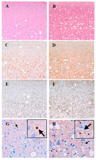- Giaccone, G.; Mangieri, M.; Capobianco, R.; Limido, L.; Hauw, J.J.; Haik, S.; Fociani, P.; Bugiani, O.; Tagliavini, F. Tauopathy in human and experimental variant Creutzfeldt-Jakob disease. Neurobiol. Aging 2008, 29, 1864–1873. [Google Scholar] [CrossRef]