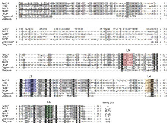 PmICP shared similar structural features with its orthologous proteins from other Plasmodium species. These proteins have different molecular features compared to other classes of cysteine protease inhibitors in that they show the absence or presence of motifs that are well conserved in cysteine protease inhibitors. Consistent with other plasmodial ICPs in the falstatin family, PmICP also had a C-terminal chagasin-like domain with a longer N-terminal region, resulting in a large protein size of approximately 40 kDa. Four evolutionary conserved loops in plasmodial ICPs, L0, L2 (BC), L4 (DE), and L6 (FG), were also tightly conserved in PmICP, albeit minor amino acid differences in these loops were identified compared to other plasmodial ICPs. Three domains (L2, L4, and L6) found in chagasin-family proteins are known to bind directly to the active site of target enzymes [17,18]. They were commonly found in plasmodial ICPs. However, an additional fourth loop, L0, which is absent in chagasin family proteins, but is typically conserved in all plasmodial ICPs [17], is present in PmICP.