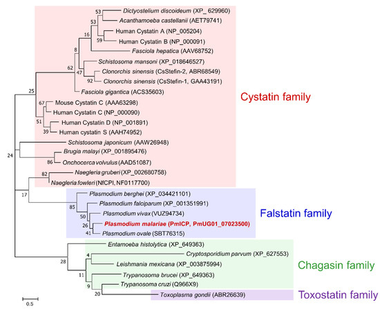 Phylogenetic analysis. The phylogenetic tree was constructed based on amino acid sequences of each protein by MEGA7 (http://www.megasoftware.net; accessed on 7 March 2022) using Maximum Likelihood Estimation (MLE) via Jones-Taylor-Thornton model with 1000 bootstrap replications. Plasmodial ICPs are clustered into a distinct clade of falstatin family separated from cystatin, chagasin, and toxostatin family proteins.