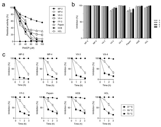 Inhibitory activities of PmICP against several cysteine proteases including falcipain family enzymes (MP-2, MP-4, VX-3, VX-4, and FP-3), papain, HCB, and HCL were determined. PmICP inhibited these enzymes in a dose-dependent manner. However, its overall inhibitory activity was much stronger against falcipain family enzymes except VX-4 than against papain and human cathepsins (Figure 4a). These results indicated that PmICP was able to inhibit diverse cysteine proteases from different species of organisms, but showed stronger inhibitory activities against plasmodial enzymes. Inhibition assay at different pH conditions revealed that the inhibitory activity of PmICP was not greatly affected by pH as its inhibitory activities against these enzymes were similar at a broad range of pH values (Figure 4b). PmICP was stable at 37 °C, however, it rapidly lost its inhibitory activity at 55 °C and 70 °C (Figure 4c). This suggest that PmICP is a thermo-labile protein.