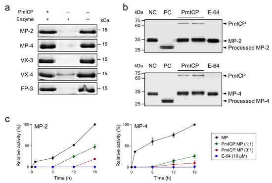 Inhibition of hemoglobin hydrolysis and maturation of MPs. (a) Inhibition of hemoglobin hydrolysis by MPs, VXs, and FP-3. Each fully activated enzyme (50 nM) was incubated either with or without PmICP (50 nM) at room temperature for 30 min. Human hemoglobin (1 mg/mL) was added to the mixture and incubated at 37 °C for 3 h. Samples were analyzed by 15% SDS–PAGE. (b) Regulation of maturation of MPs. Each MP (10 μg) was pre-incubated with PmICP (10 μg) or E-64 (10 μM), activated, and analyzed by 12% SDS–PAGE. NC, negative control before processing; PC, positive control after processing without pre-incubation neither PmICP nor E-64. (c) Regulation of maturation process of MPs. Each MP was processed to mature enzyme in the presence or absence of PmICP (1:1 or 3:1 ratio for MP) or E-64 (10 μM). Aliquots were taken at indicated time points and assayed for enzyme activity. Enzyme activity was assayed with Z-RR-MCA and Z-LR-MCA for MP-2 and MP-4, respectively.