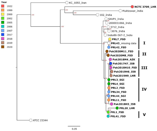 Maximum-likelihood tree, generated based on cgSNPs called by Snippy. Strains from Pakistan are printed in bold with the district of isolation given after the name (LHR—Lahore; FSD—Faisalabad; AZK—Azad Jammu and Kashmir; ISB—Islamabad; SGI—Sargodha) and the year of isolation indicated by color. For non-Pakistani strains, the country of isolation is given. The bar indicates base substitutions per site. Clusters formed by Pakistani strains are denoted by Roman numerals. Numbers in red represent bootstrap support values.