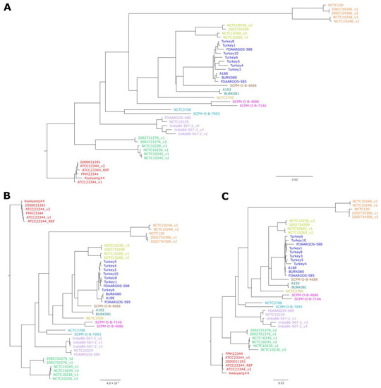 Comparison between trees generated by different approaches: (A) Neighbor-Joining tree based on cgMLST allelic profiles using 2838 target genes; (B) Maximum-likelihood tree based on cgSNP alignment generated by Snippy using Illumina read data; (C) Approximately Maximum-likelihood tree based on cgSNP alignment generated with Parsnp using genome assemblies. For convenience, clusters or singletons of strains that showed in the trees were colored identically. Bars indicate allelic changes (A) or base substitutions per site (B,C). Bootstrap values for (B,C) can be found in Figure S3.