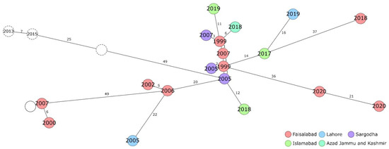Minimum-spanning tree based on cgMLST allelic profile differences. The Pakistani strains are coloured according to the place of isolation with the year of isolation given. Circles with dotted lines represent strains isolated in India. Numbers on the branches indicate the number of allelic differences. The empty, solid line circle represents strain PRL43, for which no metadata was available.