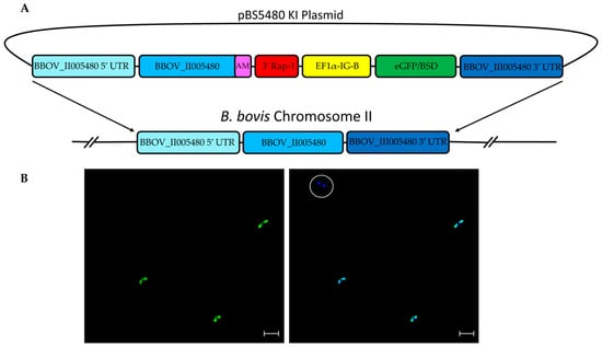 The transfection plasmid cassette (Figure 1 panel A) contained a full-length copy of BBOV_II005480 appended with a unique 108 bp (Supplemental data AM Sequence) identifying sequence before the stop codon, 3′ rap-1 stop, elongation factor promoter B intergenic region controlling the expression of the eGFP gene fused with the blasticidin S deaminase gene (eGFP-BSD), and 700 bp sequences from the 5′ and 3′ untranslated regions flanking BBOV_II005480 as guides to be inserted into the BBOV_II005480 locus by homologous recombination. The unique 108 bp sequence, which codes for 36 amino acids, was appended to allow discrimination between transfected and wildtype mRNA. The transfection cassette was directly inserted into the pBluescript plasmid and synthesized (Genscript Biotech, Corp., Piscataway, NJ, USA). The plasmid was transformed into Escherichia coli and isolated with a Qiagen endotoxin-free maxiprep kit (Qiagen Inc., Redwood City, CA, USA) following the manufacturer’s instructions.