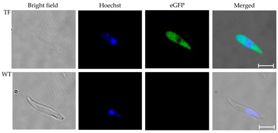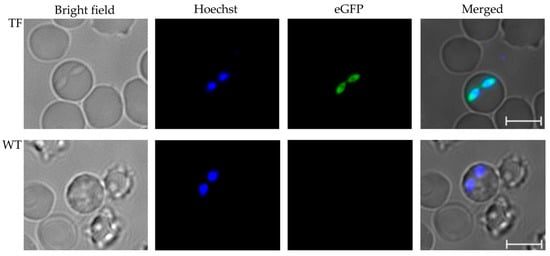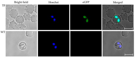 To induce sexual stages from tfBbo5480 and WT B. bovis, stabilates collected from infected calves were recovered and maintained in in vitro cultures for two weeks before induction. tfBbo5480 and WT B. bovis cultured infected erythrocytes were suspended in a medium with or without 100 μM xanthurenic acid (XA) (Sigma, St. Louis, MO, USA) as previously described [,]. Induced sexual stage live parasites were collected at 24 h post-induction. To visualize the gamete formation, parasite cells were incubated with the nucleic acid stain Hoechst 33342 (Thermo Fisher Scientific) for 30 min and washed twice with PBS. Five µL from each sample of live parasites was used per slide. Slides were examined and visualized independently by fluorescent microscopy with eGFP and DAPI channels using a Leica microscope using LAS-X software.