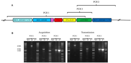 (A): PCR map to determine the integration of transfected elements into the B. bovis genome. PCR1 used a forward primer upstream of the 5′ flanking guide region and a reverse primer in the eGFP-BSD region. PCR2 used a forward primer in the eGFP-BSD region and a reverse primer downstream of the 3′ flanking guide region. PCR3 used a forward primer in the EF1α-IG-B promoter region and a reverse primer in the eGFP-BSD region. (B): Genomic DNA derived from calves infected with either wild type B. bovis (WT) or short-term in vitro cultured tfBbo5480 (TF), and plasmid pBS-5480 KI (P) (Acquisition) or genomic DNA from calves infected by larval feeding (Transmission) of either WT or TF were used for PCR and visualized in 1% agarose gels. Positive PCR1 and PCR2 reactions for both the acquisition and transmission samples were confined to the TF samples. PCR3, which amplifies within the transfection cassette, had a positive signal for both the TF and P samples.
