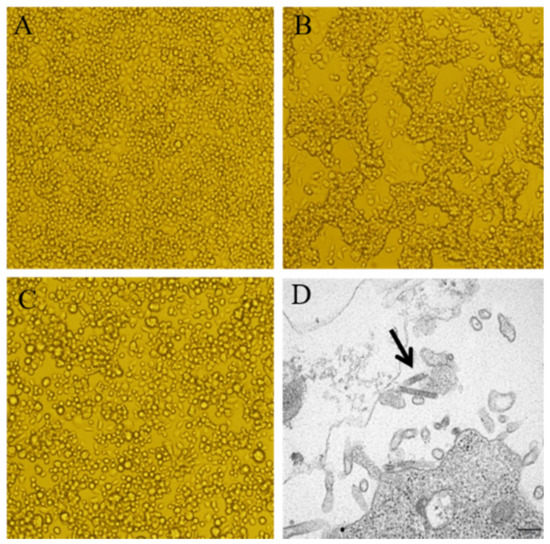 C6/36 cell cytopathic effect (CPE) caused by virus isolates and electron microscopic morphology of the virus. (A) Normal C6/36 cell morphology on day 4; (B) CPE in fourth-generation C6/36 cells inoculated with the SX1916 isolate on day 4, showing the aggregation of large numbers of cells, but no cell shedding; (C) CPE in second-generation C6/36 cells inoculated with plaque-purified SXARV (SXARV1916-2) on day 4, showing large numbers of fused cells and cell shedding; (D) SXARV morphology examined by electron microscopy. Arrow indicates a rod-shaped virus particle. Magnification for (A–C): ×200.