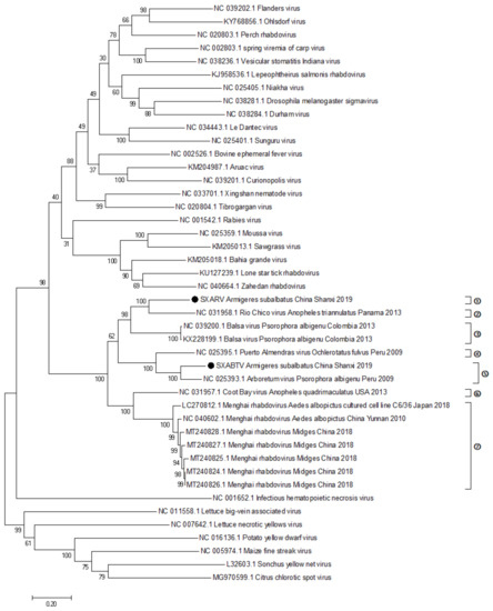 According to the virus genome sequence information obtained via NGS sequencing, we designed amplification primers to cover the full-length genome nucleotide sequence of SXARV and SXABTV, respectively, using Primer-BLAST (https://www.ncbi.nlm.nih.gov/tools/primer-blast (accessed on 5 April 2021)), and the primers used are listed in Table S4. The cDNA library of the fourth-generation supernatant of C6/36 cells inoculated with the SX1916 isolate was used as a template. PCR amplification and nucleotide sequence determination of the whole genome of each rhabdovirus were conducted using the designed primers. The non-infected control C6/36 cell lines were negative for both viruses discovered in this study. The obtained whole-genome nucleotide sequences of SXABTV and SXARV were uploaded to GenBank under accession nos. MW890015 and MW890016, respectively.