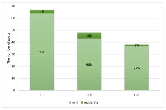 The severity of three pneumonia types in a study goat population: chronic interstitial pneumonia (CIP), purulent bronchopneumonia (PBP), and fibrinous pleuropneumonia (FPP).