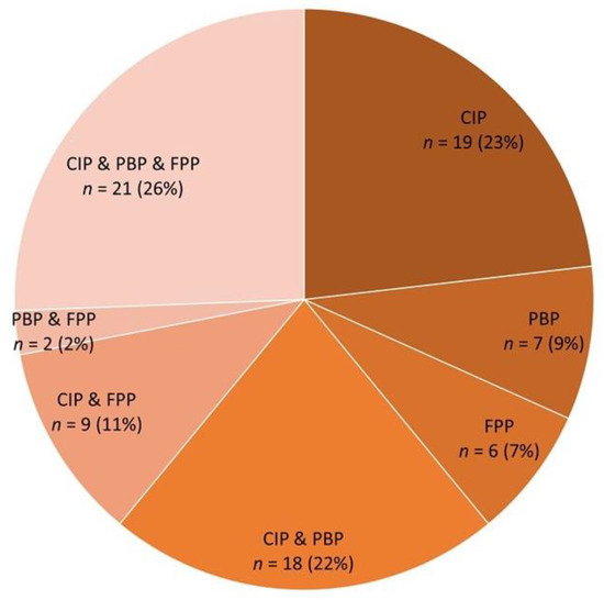 A single pattern was observed in 32 goats (27.6% of all goats, and 39% of 82 goats with pneumonia confirmed histopathologically), of which most (n = 19, 59%) had CIP. A mixed pattern was observed in 50 goats, and only in 2 of them was CIP not involved (Figure 2).