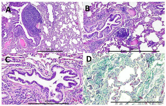 Histopathological lesions observed in the chronic interstitial pneumonia (CIP): (A) lymphatic nodules hyperplasia (peribronchial and perivascular), interstitial (i.e., peribronchiolar and perialveolar) inflammatory infiltrates composed of macrophages and lymphocytes, interalveolar septum thickening, 100×, H-E; (B) interstitial (i.e., peribronchiolar and perialveolar) inflammatory infiltrates composed of macrophages and lymphocytes, interalveolar septum thickening, 200×, H-E; (C) smooth muscle hyperplasia in the walls of the bronchioles, 400×, H-E; and (D) interstitial connective tissue hyperplasia, 200×, Masson.