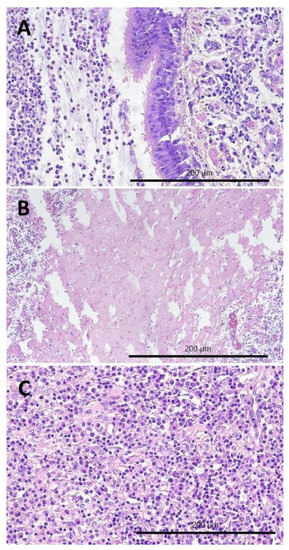 Histopathological lesions observed in the purulent bronchopneumonia (PBP), 400×, H-E: (A) peribronchial inflammatory infiltrates composed of neutrophils and lymphocytes, purulent exudate in the lumen of bronchus; (B) focal necrosis of lung parenchyma; and (C) focal atelectasis.