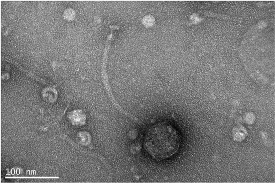 Transmission electron microscopy picture of Vibrio phage Virtus showing a typical morphology of siphoviruses.