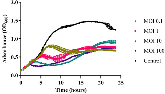 In vitro lysis of Vibrio phage Virtus against V. harveyi VH2 at MOIs 0.1, 1, 10, and 100 for 24 h. Bacterial growth indicated by the absorbance (OD600) read. Error bars were shown for the mean of n = 3.