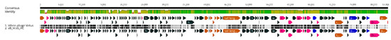The genome of Vibrio phage Virtus was sequenced using the DNBSEQ™ sequencer using paired-end technology (PE100) at BGI, Hong Kong. The workflow for library preparation for the platform included fragmentation, size selection, end repair and A-tailing, bubble adaptor ligation, PCR amplification, denaturation, splint circularization, enzymatic digestion and purification, and DNB making. Raw reads were filtered if more than 25% matched the adapter sequence, if more than 50% bases had quality values lower than 20 and if there were more than 3% N in the read. Filtering was completed using the SOAPnuke software. The raw reads were quality inspected and were assembled by Unicycler v0.4.8 in PATRIC [24]. QUAST v4.6.3 [25] and BBMap v38.88 [26] were used to map the reads back to the assembled genome, while PhageTerm was used to predict phage termini [27] through the Galaxy server [28]. RASTk, Glimmer, and GeneMark were used for gene prediction. Sixpack, a naive gene caller, was used as validation to annotate genes that may have been missed by Glimmer. Moreover, potential protein-coding genes were manually checked to ensure the presence of a phage start codon (ATG/GTG or TTG), and a Shine–Dalgarno feature was added to all features that had a detectable match. Proteins of Vibrio phage Virtus were manually annotated using (i) NCBI Basic Local Alignment Search Tool (BLAST) [29] adjusted at non-redundant (nr) protein database, (ii) Gene Ontology [30], (iii) InterPro [31], and (iv) TΜHMM 2.0 [32,33]. Predicted proteins of Vibrio phage Virtus were also manually annotated with NCBI Conserved Domain Database (NCBI CDD) [34]. All ORF predictions and annotations were manually inspected. Integrase, virulence, and antibiotic-resistance-encoding genes in Vibrio phage Virtus were for searched using the INTEGRALL Database webserver [35], Virulence Factor Database (VFDB) [36], and VirulenceFinder and ResFinder webservers [37]. The host Vibrio harveyi VH2 genome was analyzed for prophage-like sequences using Phage Search Tool Enhanced Release (PHASTER) [38]. A computational analysis using Bacphlip [39] was conducted in order to assess phage lifestyle on the basis of phage proteome. For protein structural homologies, only probabilities above 90% were accepted for manual protein function assignment of the Vibrio phage Virtus predicted ORFs. All hits were in existing databases with expected E-value below 10−3. The genome of Vibrio phage Virtus with annotated predicted ORFs was then visualized in a circular representation with Geneious software (Geneious v9.1, Biomatters, Auckland, Australia) and CGview.