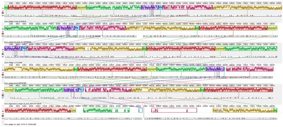 Whole genome alignment with progressive MAUVE of Vibrio phage Virtus with similar phages. From the top is Vibrio phage Virtus, vB_VcaS_HC, Vibrio phage 1, Vibrio phage Ares1, vB_ValS_PJ32, and vB_VpaS_VP-RY-9. The colored collinear blocks indicate homologous regions between genome sequences, while the height of the similarity profile in the collinear blocks indicate average level of conservation in the regions of the genome sequence. Inverted blocks indicate homologous regions that align in the complement orientation.