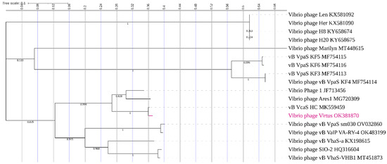 Wide genome proteomic tree analysis confirmed that Vibrio phage Virtus belongs to the Siphoviridae taxonomic family (Figure 9). In addition, Vibrio phage Virtus was predicted to infect hosts from the Gammaproteobacteria class, which includes the Vibrionaceae family.