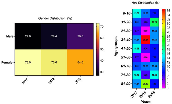 This study describes the antimicrobial pattern and associated virulence genes in strains of Escherichia coli strains from urinary tract infections (UPECs) as seen over a period of three years in the Al-Ahsa region of Saudi Arabia. Samples were more often from females than males, and the highest amount came from the 30–40 year-old age group, findings that are consistent with those of a previous report [40]. Additionally, the isolates here were classified into A, B1, B2, and D phylogroups, with significantly more isolates in B2 (62.4%) and D (20.6%), suggesting the UPEC strains could be extraintestinal pathogens responsible for the UTIs [18]. The least common phylogroups were A and B1, which are considered as commensals. These findings are similar to those of other researchers [41,42,43].