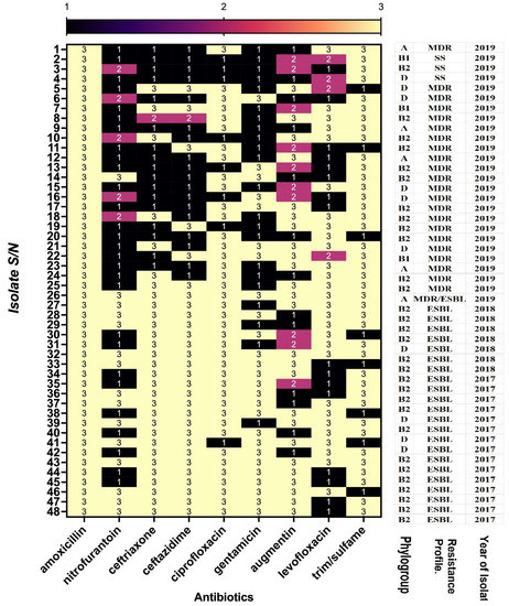Comparison of antimicrobial resistance, isolate phylogenetic group, and the year of isolation: multidrug resistant (MDR); susceptible strain (SS); and extended-spectrum beta-lactamases (ESBL). Resistant (3); intermediate (2); sensitive (1). The figure shows the 48 UPEC isolates and their susceptibility to antimicrobials commonly used for treatment.