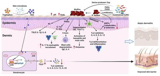 In addition to the pathogenic role of S. aureus, homeostasis of skin microbiota is vital for normal skin barrier function, the cutaneous immune balance, and the elimination of possible pathogens, thus modulating AD pathogenesis [86]. Germ-free mice exhibited a significantly different skin transcriptome [87]. Germ-free mice displayed impaired skin barrier function, a direct consequence of the abnormal epithelial development and differentiation [88]. Treating a 3D skin tissue model with a mix of selected members of normal skin microbiome profoundly improved the barrier integrity of the tissue [89]. In this section, we discuss how the skin microbiota regulates two major aspects: (1) AMPs, and (2) the tryptophan metabolites-aryl hydrocarbon receptor (AHR) axis. Together with the pathogenic roles of S. aureus in AD, these mechanisms are summarized in Figure 1.