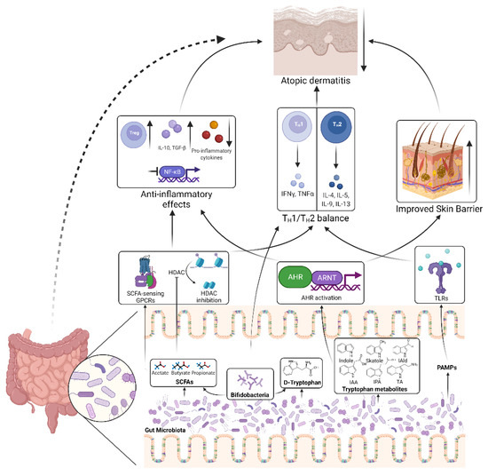 Mechanisms of how gut microbiota regulate AD pathogenesis. Short-chain fatty acids (SCFAs) produced by the gut microbiota are able to activate SCFA-sensing G-protein coupled receptors (GPCRs) and/or inhibit histone deacetylases (HDACs), thus activating downstream signalling cascades that suppress inflammatory responses and restoring TH1/TH2 balance. Microbial metabolite, D-tryptophan can also restore TH1/TH2 balance. Bifidobacteria, a genus of bacteria to which many probiotics belong, are an important source of these metabolites. Microbial tryptophan metabolites can activate the aryl hydrocarbon receptor (AHR), which inhibits inflammatory responses and improve the epidermal barrier of skin. Pathogen-associated molecular patterns produced by the gut microbiota can activate toll-like receptors (TLRs) thus restoring TH1/TH2 balance. All these mechanisms benefit AD. IAld, indole-3-aldehyde; IAA, indole-3-acetic acid; IPA, indole-3-propionic acid; TA, tryptamine; ARNT, aryl hydrocarbon receptor nuclear translocator. Created with BioRender.com (accessed on 4 May 2022).