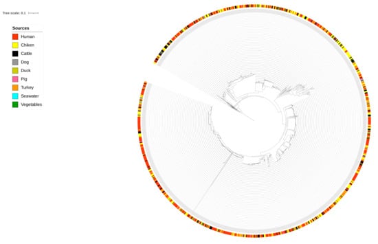 The human cases data set consisted of isolates received from Statens Serum Institute’s surveillance from January 2015 to December 2017. Isolates from humans with known travel history were not included in the data set. Data cleaning was performed to remove duplicates and isolates with incomplete metadata. The input data set for the network analysis consisted of cgMLST and wgMLST distance matrices from 717 food and 717 human isolates and SNPs from 720 food and 720 human isolates. The SNP distance matrix contained more isolates than cgMLST and wgMLST due to more matching isolate identification codes between the SNP data and the source metadata. The population structure was obtained from the phylogenetic analysis, as shown in Figure 1. This indicated that human isolates intermixed with other food and animal isolates, indicating that human Campylobacter strains were more likely to have originated from the sources described. Furthermore, sources were also genetically well distributed within the tree. Seawater and vegetables were omitted from the final input data used for network analysis since they were few and would have resulted in unreliable source attribution of human Campylobacter cases. All isolates used can be found under the bioproject number set up by the Statens Serum Institute, PRJEB31119 [].