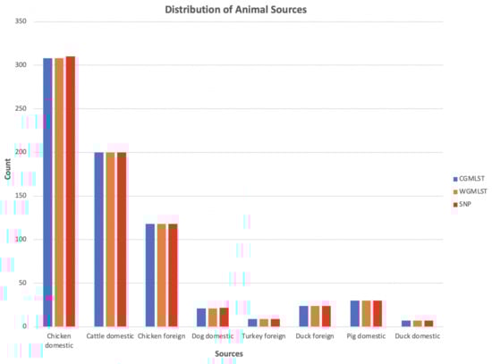 Different approaches have been used for source attribution using WGS data sets, including machine learning which has previously been applied in source attribution for Salmonella enterica, Escherichia coli and C. jejuni [,,,] and to predict the severity or outcome of microbial infections [,,,,]. The machine learning approach involves training different algorithms and obtaining the best-performing model while obtaining the attribution probabilities of human isolates to different sources. Network analysis, on the other hand, has recently been demonstrated as an accurate approach for the source attribution of human salmonellosis []. Network analysis is based on weighted networks theory, where pairwise distance matrices from source attribution can be visualized as fully connected networks. Nodes in this theory correspond to Campylobacter isolates and links correspond to genetic distances. Weaker links imply greater genetic distance between isolates. Network analysis is useful in extracting network communities corresponding to different animal sources, where network communities correspond to groups of vertices with a higher probability of being connected to each other than other members of that group [].