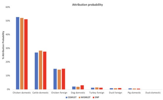 Mean probability (in percentage) of a human isolate to be attributed to a source, calculated for each of the considered pairwise distance matrices (cgMLST, wgMLST and SNP).