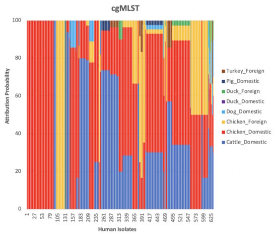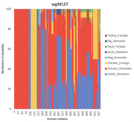 The probability of a human isolate to originate from each source as determined by source attribution analysis using the network-based approach on the wgMLST pairwise distance matrix.