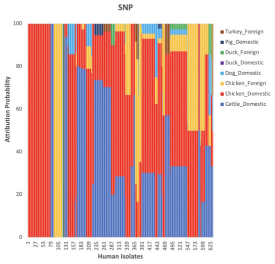The probability of a human isolate to originate from each source as determined by source attribution analysis using the network-based approach on the SNP pairwise distance matrix.