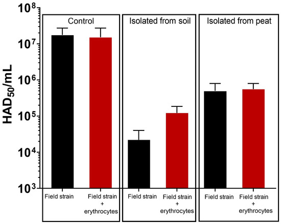 The isolation of the infectious field strain ASFV from different matrices (soil and peat) compared with its isolation from the control virus suspension. ASFV titres are expressed as mean ± SE of the HAD50 per ml, and the experiment was performed in duplicate.