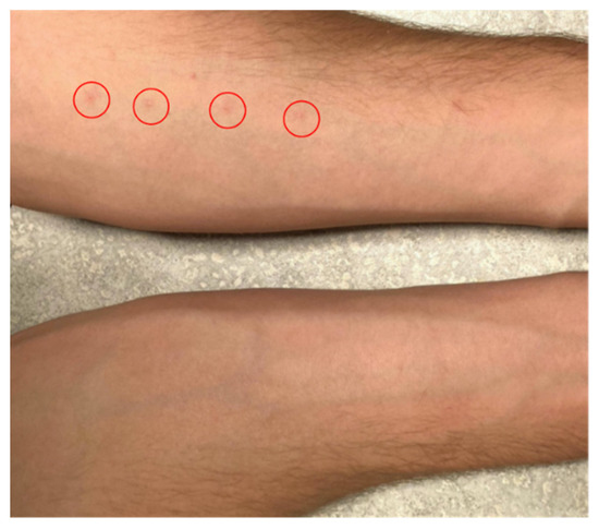 Participants returned for follow-up observation 24–72 h later. The number of papules on each arm was recorded, and non-identifying photos were taken (e.g., Figure 1). All participants were asked if they experienced any itching, when they first noticed papules appearing, whether papules had increased or decreased in size over time, and if they had applied any anti-itch creams. To determine if prior exposure might increase the number of responses to ASC cercariae, participants who developed papules were also asked if they were willing to return for a second exposure. Eight participants agreed to be exposed a second time, 10–20 days after their first exposure, and to return for follow-up observation. Calipers were used to measure papule diameters for 10 random participants over the course of the study. We fitted a mixed-effects logistic regression model to predict the probability of papules as a function of first vs. second exposure, parasite species, inland lake swimming experience, and previous swimmer’s itch experience, with the random effect of the individual. Models were fitted with R version 4.0.4 using package glmmTMB [51,52].