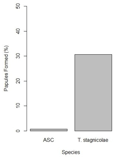 The data were first analyzed by a statistical model that treated each drop as an opportunity for papule formation, with a minimum of 0 and maximum of 5 for each individual. The effects of previous swimmer’s itch experience, inland lake swimming experience, first vs. second exposure, and parasite species were tested on the probability of papule formation using a mixed effects logistic regression, with the individual exposed as a random effect. Only parasite species was significant (X2 = 25.4828, p = 4.45 × 10−7). Odds ratio computation indicated that the odds of papule formation decreased by a factor of 45.5 for ASC compared to T. stagnicolae (95% CI: 10.3, 200.5).