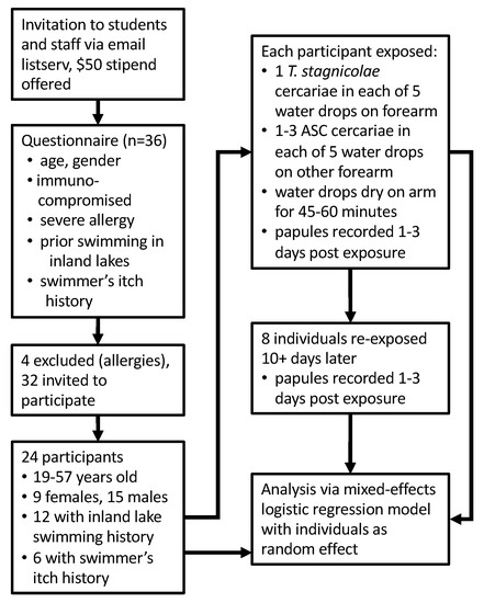 Procedures for recruitment are outlined in Figure 4. Volunteers from Calvin University were recruited for the study via an announcement on campus email listservs. Interested candidates were asked to complete a 10-item questionnaire requesting age, gender, health (especially any possible compromised immune status) and allergy information, prior swimmer’s itch experience, and inland lake swimming history (the Great Lakes have very little swimmer’s itch, so were not included). As a precaution, four candidates were excluded from the study because they declared a health or allergy condition that might have increased their risk of a severe reaction. Thirty-two candidates remained and were invited to participate, with 24 individuals (ages 19 to 57; 9 females and 15 males) responding and participating. Of those, 12 participants reported past swimming in Michigan inland lakes, and 6 participants reported a previous experience with known or probable swimmer’s itch. Study participants received a $50 stipend.