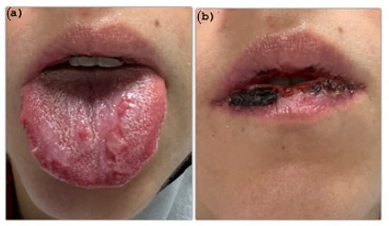 (a) blisters and ulcers on dorsal surface of the tongue; (b) necrotic tissue and hemorrhagic crusting on the vermilion lower lip.