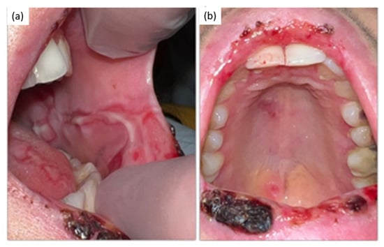 Local examination of the mouth showed diffuse and symmetrical oral ulcerations aphthous-like in the buccal mucosa and a superficial necrosis with some hemorrhagic areas in the vermilion lips and in the posterior pharynx (Figure 1a,b and Figure 2a,b).