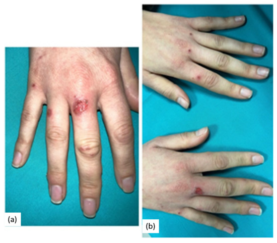 Bilateral cutaneous lesions were also evident on the hands. They consisted of itchy erythematous macules, with rounded, circulate erythema, known as target lesions (Figure 3a,b). No fever was observed.