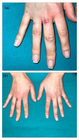 - Jimenez-Cauhe, J.; Ortega-Quijano, D.; Carretero-Barrio, I.; Suarez-Valle, A.; Saceda-Corralo, D.; Moreno-Garcia Del Real, C.; Fernandez-Nieto, D. Erythema multiforme-like eruption in patients with COVID-19 infection: Clinical and histological findings. Clin. Exp. Dermatol. 2020, 45, 892–895. [Google Scholar] [CrossRef] [PubMed]