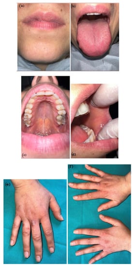 - Dalipi, Z.S.; Dragidella, F. Oral Manifestations of Exudative Erythema Multiforme in a Patient with COVID-19. Case Rep. Dent. 2021, 8, 1148945. [Google Scholar] [CrossRef] [PubMed]