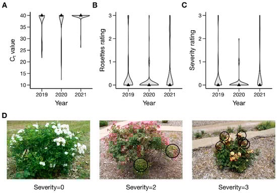 Figure 1. Distribution of rose rosette disease. (A) Ct value; (B) rosette ratings; (C) severity ratings in 2019, 2020, and 2021 across diploid rose families grown in Crossville, Tennessee; and (D) examples of the RRD severity scale with symptoms indicated by black circles. In violin plots, width of each shaded portion reflects the proportion of samples in that area. Black triangles indicate the median. Within each trait for a given year, the median, first interquartile, and third interquartile were equivalent; thus, only the median was plotted. Samples that were negative for RRV as determined by qRT-PCR were assigned a Ct value of 40. Rosettes were scored on a scale of 0–3, where 0 = no rosettes, 1 = one rosette, 2 = two rosettes, and 3 = three or more rosettes. Severity was rated on a scale of 0–3, where 0 = no symptoms, 1 = one shoot with symptoms, 2 = two shoots with symptoms, and 3 = three or more shoots with symptoms. Photographs of infected plants courtesy of Jennifer Olson, Oklahoma State University.