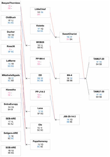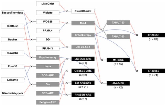 Figure 8. Pedigree of the TX2WSE diploid rose families (indicated in black) used in this study. Progeny numbers indicate the number phenotyped in Crossville, Tennessee for RRD resistance. Direct parents are indicated with gray, and red and blue lines indicate female and male parents, respectively. Founders and progenitors are indicated in white. SEB-ARE and SOB-ARE indicate Swamp Rose EB ARE and Swamp Rose OB ARE, respectively. Figure created with Pedimap v1.2 (Wageningen University and Research, Wageningen, The Netherlands) [33].