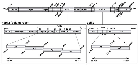 Representation of the SARS-CoV-2 genome, encoded proteins, and amplicons analyzed by UDS. In the two boxes below the scheme of the genome, the two genomic regions under study have been expanded, with genome residue numbers according to reference genome NCBI accession number NC_045512.2. The position of relevant protein domains is indicated. Left box: polymerase A to G motifs in the RdRp, and other domains of nsp12. Right box: spike (S) receptor binding motif (RBM) within the receptor binding domain (RBD), and the S1/S2 cleavage site. The amplicons analyzed in the present study are depicted as horizontal boxes [A1 to A4 for the nsp12 (polymerase) region, and A5, A6 for the S region]. Residue numbers delimiting each of the amplicons are shown, and the amino acid residues analyzed in the two proteins are indicated in the bottom lines. Materials and procedures used for amplicon preparation are detailed in Materials and Methods.