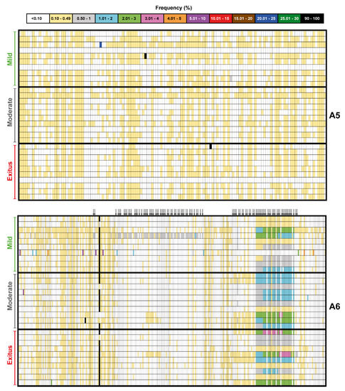 Heat map of point mutation and deletion frequencies for the spike-coding region (genomic residues 22,872–23,645) in mutant spectra of SARS-CoV-2 from individual patients with a cut-off value of 0.1%, divided according to associated COVID-19 severity (indicated on the left of each map). Data are presented in two blocks that correspond to the two amplicons (A5 to A6); the genomic residues spanned by each amplicon are shown in Figure 1. Only positions with a mutation or those affected by a deletion (arrow symbols at the top of the lower block) are represented; the complete list of mutations, their position, type, deduced amino acid substitutions, their acceptability, and association with disease severity, are listed in Tables S3 and S4. The mutant frequency has been visualized with a color code displayed in the heading box. Each row corresponds to a patient whose clinical profile and identification code were previously reported [47]. Mutations and deletions have been identified relative to NCBI reference sequence NC_045512.2. Procedures are detailed in Materials and Methods.
