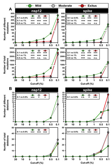 The analysis of deep sequencing data was completed by comparing the number of mutations and deletions that were identified when setting the cut-off frequency value at 20%, 10%, 5%, 2%, 1%, 0.5%, and 0.1%. This provided a visualization of the dramatic overabundance of low-frequency mutations and deletions, with their statistical support (Figure 5). The results with the series of cut-off levels below 1% confirm that the mutation abundance in SARS-CoV-2 mutant spectra is consistently larger for isolates associated with mild than moderate or severe COVID-19, as previously reported [47]. The corresponding numbers of deletions [that span from 2 to 52 nucleotides in the nsp12 (polymerase)-coding region and from 2 to 51 nucleotides in the S-coding region] are displayed in Figure S1 with an indication of the number of patients in whom each deletion was found. The overwhelming abundance of low-frequency point mutations and deletions in SARS-CoV-2 mutant spectra begs for investigation of their origin and their significance as potential reservoirs of alternative phenotypes (see Discussion).