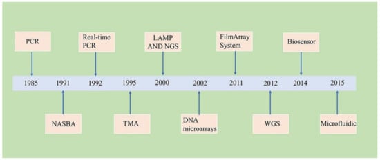 Timeline of major molecular techniques for the diagnosis of bacterial infections.